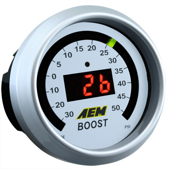 AEM’s Digital High Boost gauge unites unsurpassed accuracy, speed and control with an easy to read, digital interface. The AEM analog gauge also offer a 0-5v analog output for use with data loggers and virtually any engine management system, such as the AEM EMS or FIC.