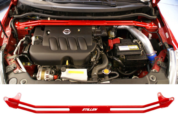 A STILLEN Front Strut Tower Brace will improve handling and increase chassis rigidity. A simple bolt-on application. Once installed, the Versa Strut Tower Brace offers sharper handling - while giving your engine bay an added touch of style. Strut Tower Brace has a laser-cut STILLEN Nameplate and is finished in Red powder coat.
