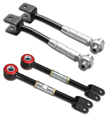 Now that you have lowered the ride height and added bigger more aggressive wheels to your 350Z and G35 the next important step is proper alignment. STILLEN has the solution that you are looking for. STILLEN Introduces the complete kit to correctly re-align your sports car's suspension, Rear Camber Adjusters (#308365) and Rear Adjustable Toe Arms (#308335). In stock form the Z and G factory step up is already pushed to its limits, by adding bigger wheels and lowering your vehicle you're now prone to misalignment and premature and uneven tire wear. STILLEN's Rear Adjustable Toe Arms and Rear Camber Adjusters allow you to adjust the rear toe angle and camber on your sports car to proper specs. They also alleviate the issue of premature tire wear due to incorrect toe angles while improving traction, stability and handling. This kit includes both rear camber addjuster and rear adjustable toe arms.