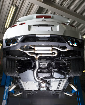 The Spec Street exhaust for the 2009+ Nissan GT-R is made up of a 304 stainless steel main pipe section and an inconel rear muffler section for a weight saving of 17.4 lbs overall. The sound levels come in at 90dB wearing standard front pipes or 98dB with optional aftermarket front pipes.