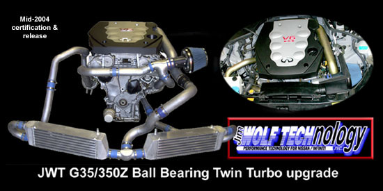 To update you on the JWT 350Z/G35 Twin Turbo system, JWT has completed development and are in the final tuning & emission cert. process. This system uses a pair of JWT 530BB Ball bearing turbos JWT presently offers for the Z32 TT. While the package is targeted at 400HP, the 530BB turbos are designed for 530HP, offering a lot more potential with internal engine mods. Check back here, as JWT gets closer to the release. Thanks for your patience; we are sure it'll be worth the wait!
