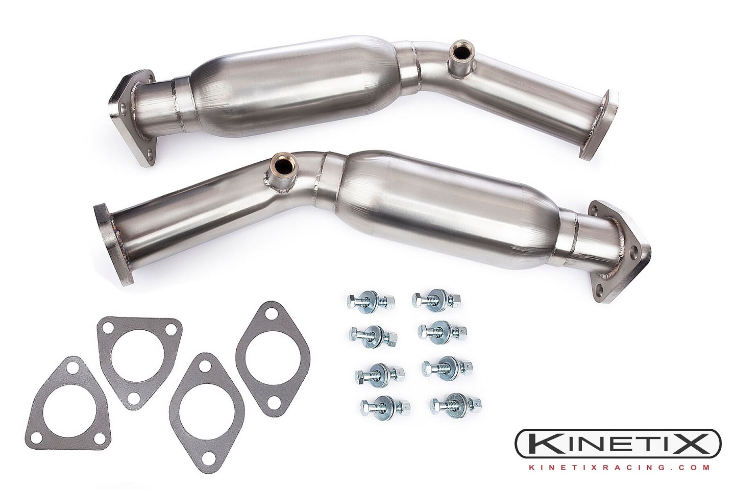 These Kinetix racing Test pipes replace the 2003-2006 Nissan 350z's factory catalytic converters, letting all the exhaust pass through freely, but not the noise. Plain test pipes offer the highest level of flow, but often result in a "raspy" exhaust note between 3-4k rpm. Test pipes have always been high on the "bang for the buck" list, but the louder exhaust note can be too aggressive for some people. So we now offer a full stainless straight through converter replacement, but with a stainless exhaust resonator welded in-line. This gives an equal amount of flow, but without the raspiness. The exhaust note will only be slightly louder, and have a slightly deeper tone.