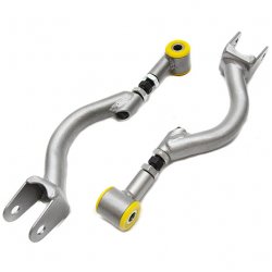 Rear excess negative camber is a problem for RWD Nissans when lowered beyond 1.75 inches. The stock eccentric camber bolt has limited rear arm adjustment. When you start to really slam your 240SX, you require more rear negative camber adjustment. Too much negative camber will drastically wear out the inside contact patch of your expensive rubber, and also not allow for maximum braking and acceleration due to the offset tire patch. The rear end may handle great, but you’ll burn up your insides of your tires in a very short time. Properly correcting this common problem can be solved by adding adjustable upper control arms. Whiteline adjustable rear control arms are crucial to increase positive caster on your 95-98 Nissan 240SX. These control arms eliminate any excess rear flex from hard drifting or cornering, and allows custom rear camber settings faster and easier than the stock camber bolts.