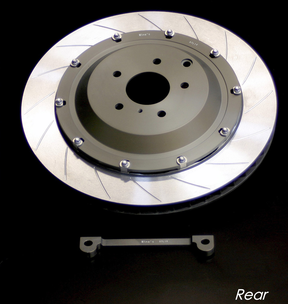 The Mines Rear Big Brake Rotor Upgrade Kit for the Nissan GT-R R35 uses the factory caliper and includes 16 slot front discs and replacement brackets for the stock caliper.