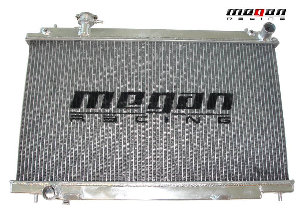 We are proud to introduce the new Megan Racing high performance aluminum radiator. Anytime an individual introduces their car to a racing/drifting environment, the temperature of the vehicles engine will skyrocket. One common and effective method of reducing engine temperature is to employ an aluminum radiator. This is a cost effective upgrade which can ultimately save an engine during competition or spirited driving. Often times, a temperature drop of twenty degrees or more will be noticed when using an aluminum radiator. Also included is a 1.1 BAR radiator cap.