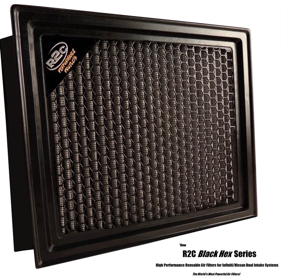 R2C lifetime Black Hex filters for 350z VQ35HR dual intake applications offer flow rates 4 times better than any other 350z filter while offering the engine protection you need. Black Hex replacement air filters improve acceleration and allow your engine to work much less hard to breathe the air it needs for maximizing performance. No Oiling!