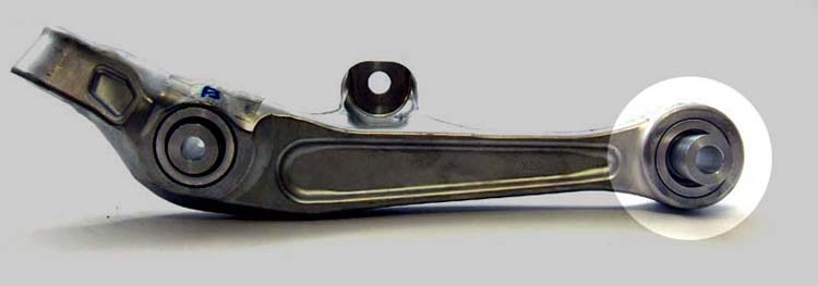 Our SPL PRO front lower arm bushings replace the stock mushy rubber bushings with low-friction articulating spherical bearings, eliminating bushing flex and reducing friction. This maintains optimum suspension geometry under load, to improve handling and feedback.
