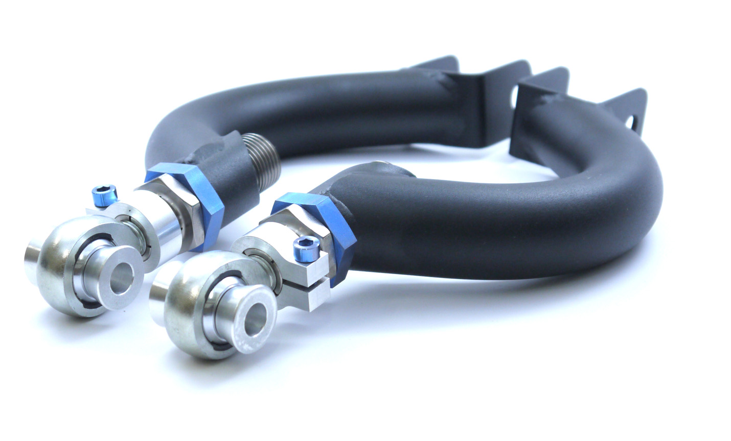 Our SPL TITANIUM series arms feature massive 1.5" DOM tubing, professionally tig welded at a 10 deg angle to allow for increased clearance from the arm to the frame on lowered cars. Our exclusive 4130 chromoly hybrid adjuster offers quick and precise adjustment, and is CNC gundrilled to reduce weight. Blue anodized titanium hardware shaves even more unsprung weight from the arms, without compromising strength.